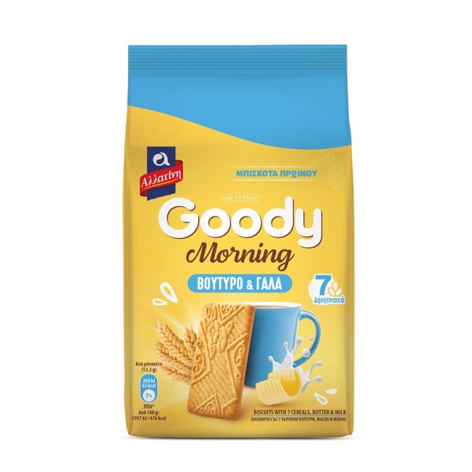 Τα μοναδικά αρώματα, οι αγαπημένες γεύσεις και η φροντίδα Goody που σε συντροφεύει για χρόνια, τώρα και στα μπισκότα πρωινού Goody Morning με 7 δημητριακά. Γιατί κάθε πρωινό αξίζει να είναι Goody. Τα μπισκότα Αλλατίνη Goody Morning φέρνουν ζεστασιά και θαλπωρή σε κάθε πρωινή στιγμή με την παράδοση και την κληρονομιά των Goody.