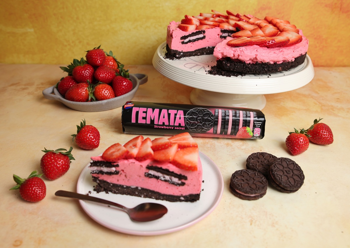 - Αφαιρούμε το τσέρκι από το ψυγείο, ξεφορμάρουμε, διακοσμούμε την επιφάνεια με φράουλες, κόβουμε σε κομμάτια και σερβίρουμε.